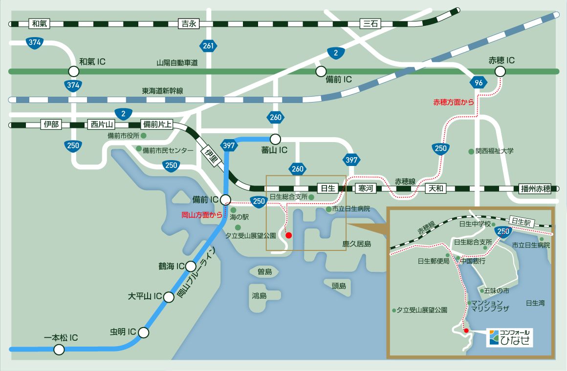 ブルーライン「備前I.C.」から250号線を東へ約3km・約5分で日生。日生郵便局方面の信号を右折(南)850m。 岡山市内から約50分。